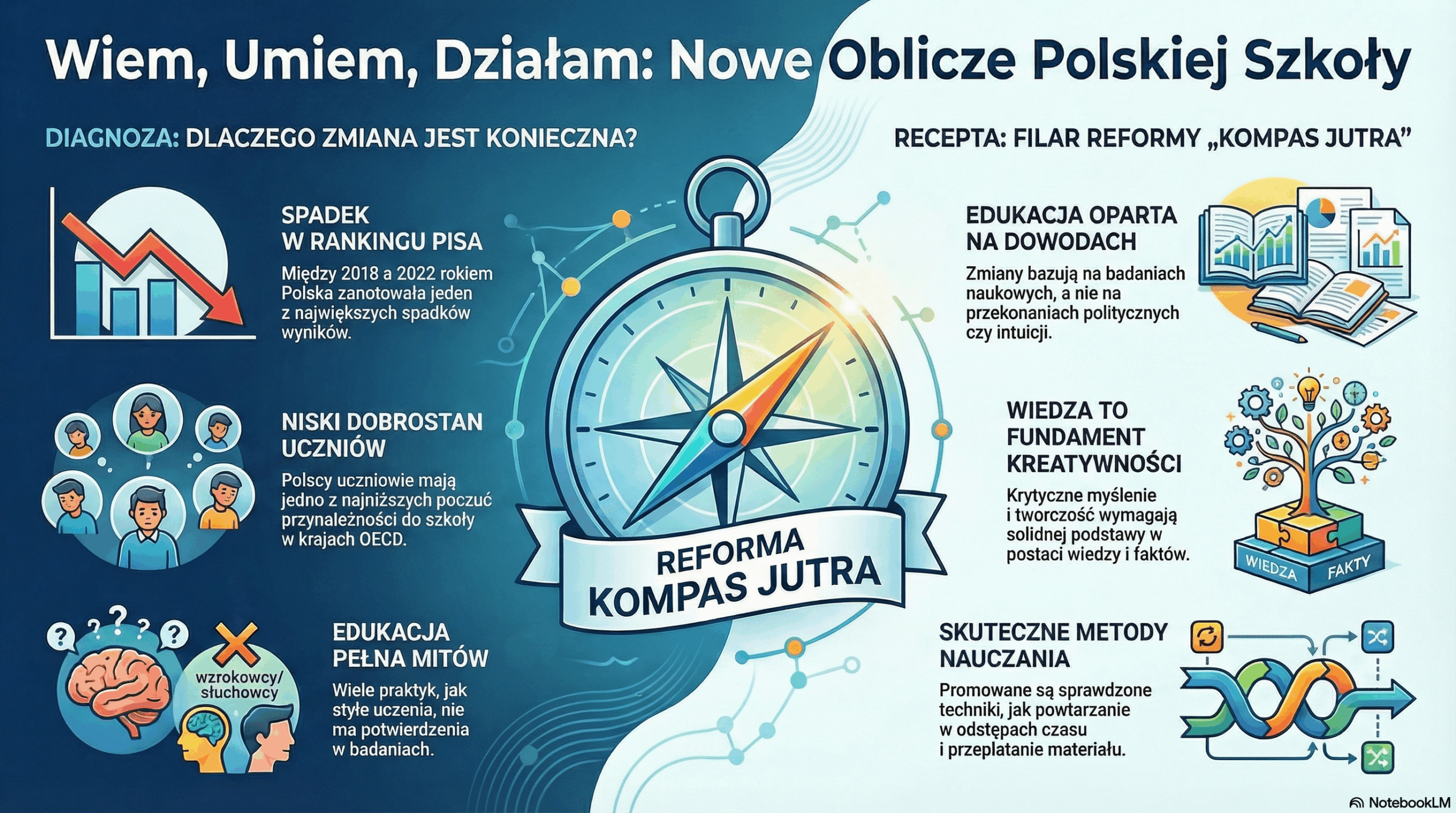 w rozumieniu tekstu, gdzie problemem bywa słownictwo wynoszone z domu (czyli nierówny arsenał wiedzy wyjściowej). - Kompetencje Kluczowe: Reforma koncentruje się na rozwoju kompetencji kluczowych, takich jak krytyczne myślenie, kreatywność, współpraca, a także metapoznanie i samoregulacja (świadomość ucznia, jak się uczyć). Są to umiejętności potrzebne do ciągłego rozwoju