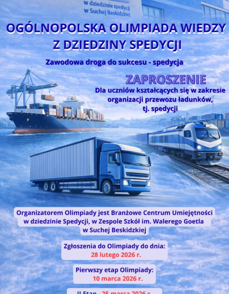 Branżowe Centrum Umiejętności w Suchej Beskidzkiej w dziedzinie spedycji zaprasza uczniów szkół ponadpodstawowych, kształcący się w zawodach, których podstawa programowa obejmuje treści związane z tematyką organizacji przewozu ładunków tj. dziedziną spedycji, do udziału w Ogólnopolskiej Olimpiadzie Wiedzy „Zawodowa droga do sukcesu – spedycja”.