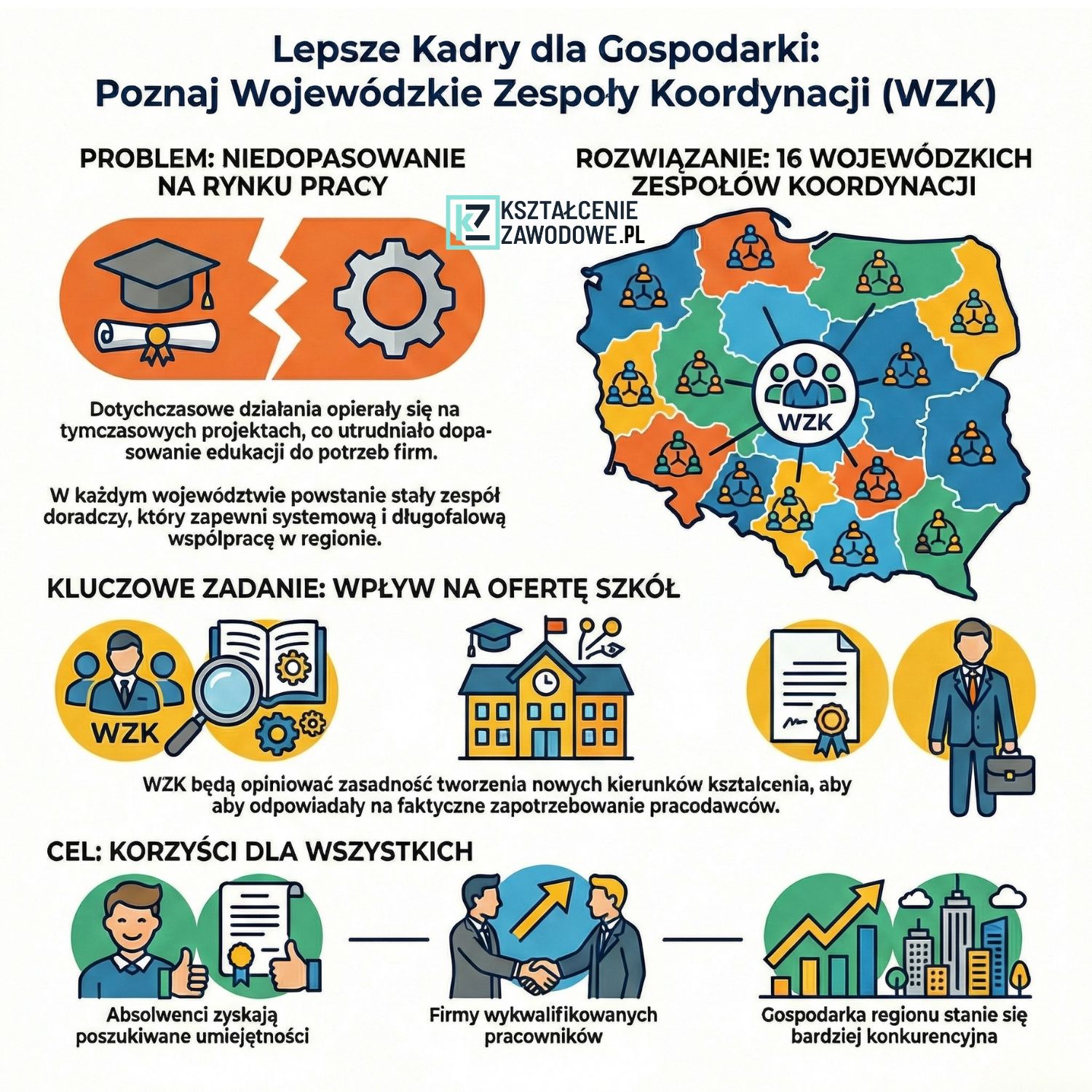 Projekt ustawy precyzuje szeroki katalog zadań WZK, koncentrując się na integracji edukacji z rynkiem pracy. Do najważniejszych należą: