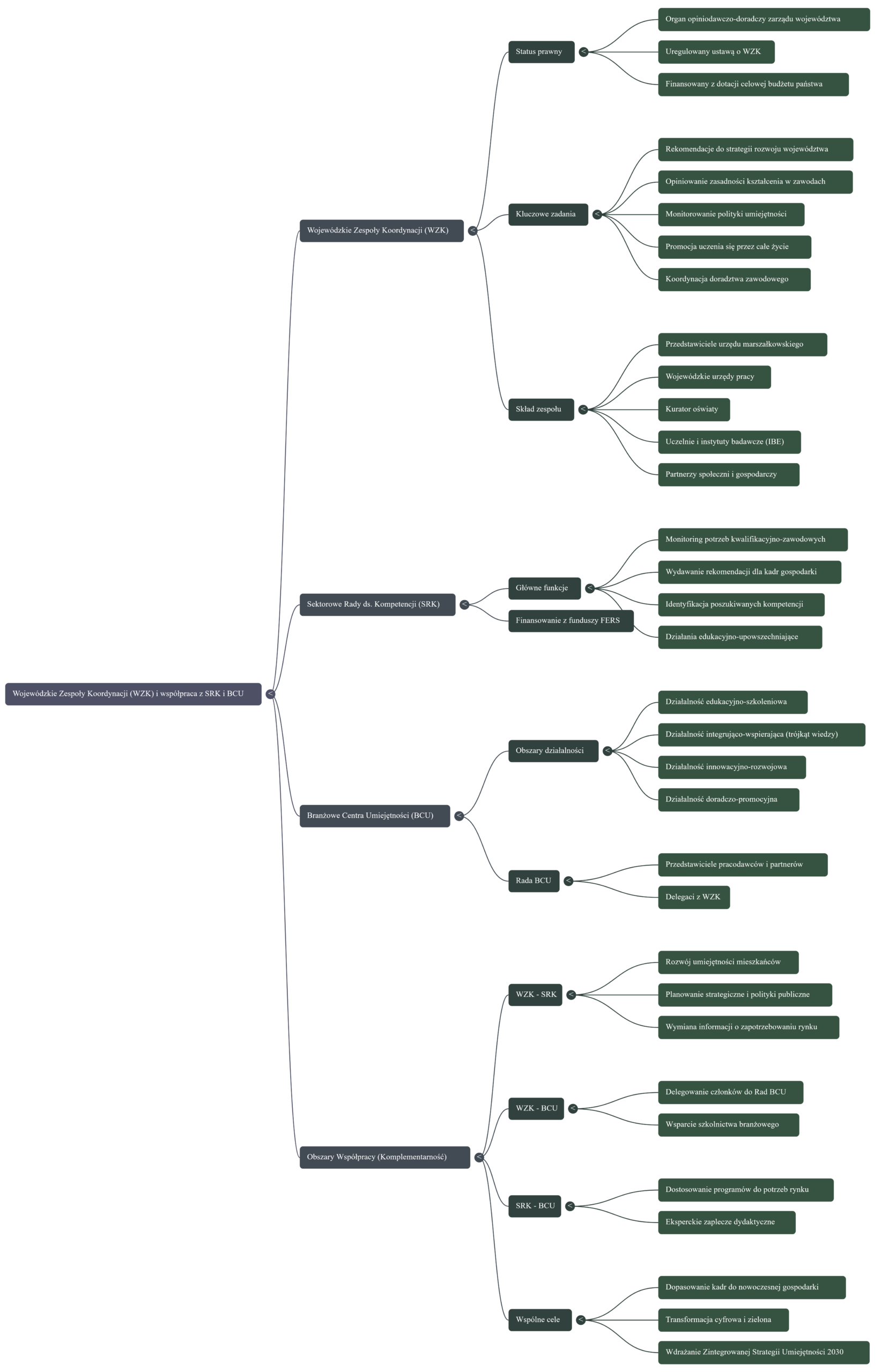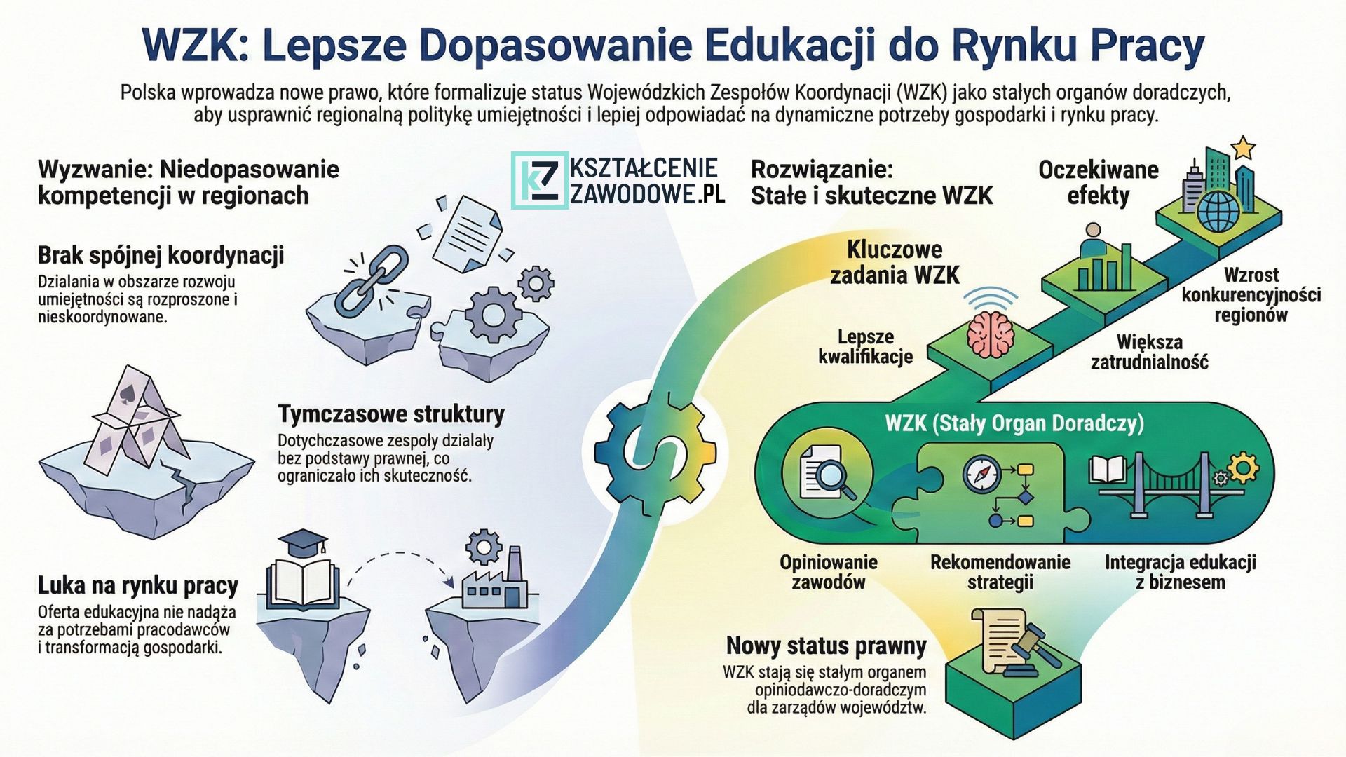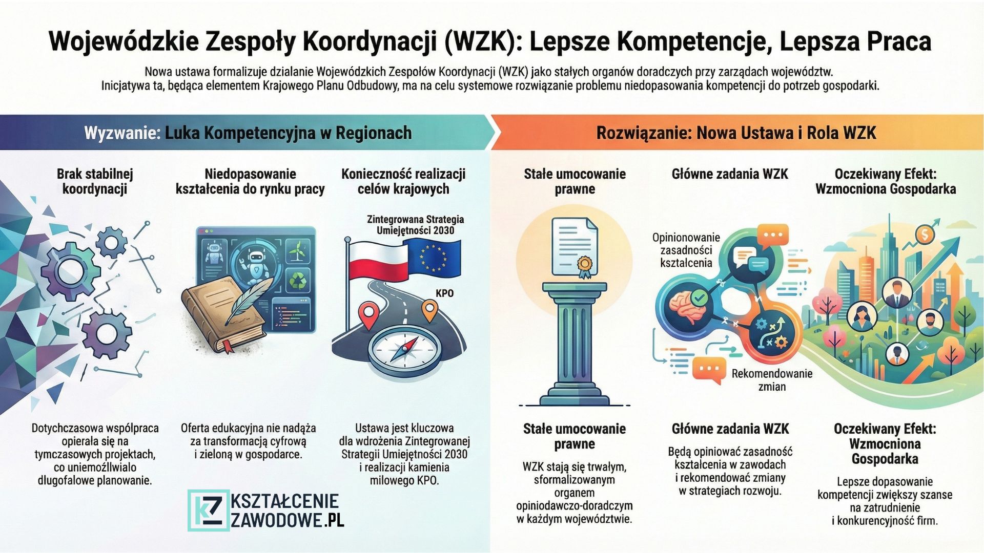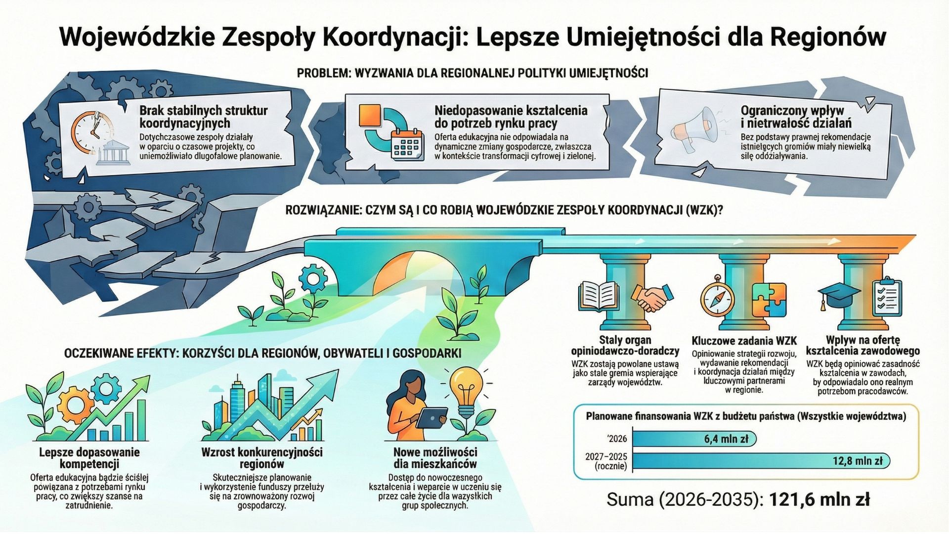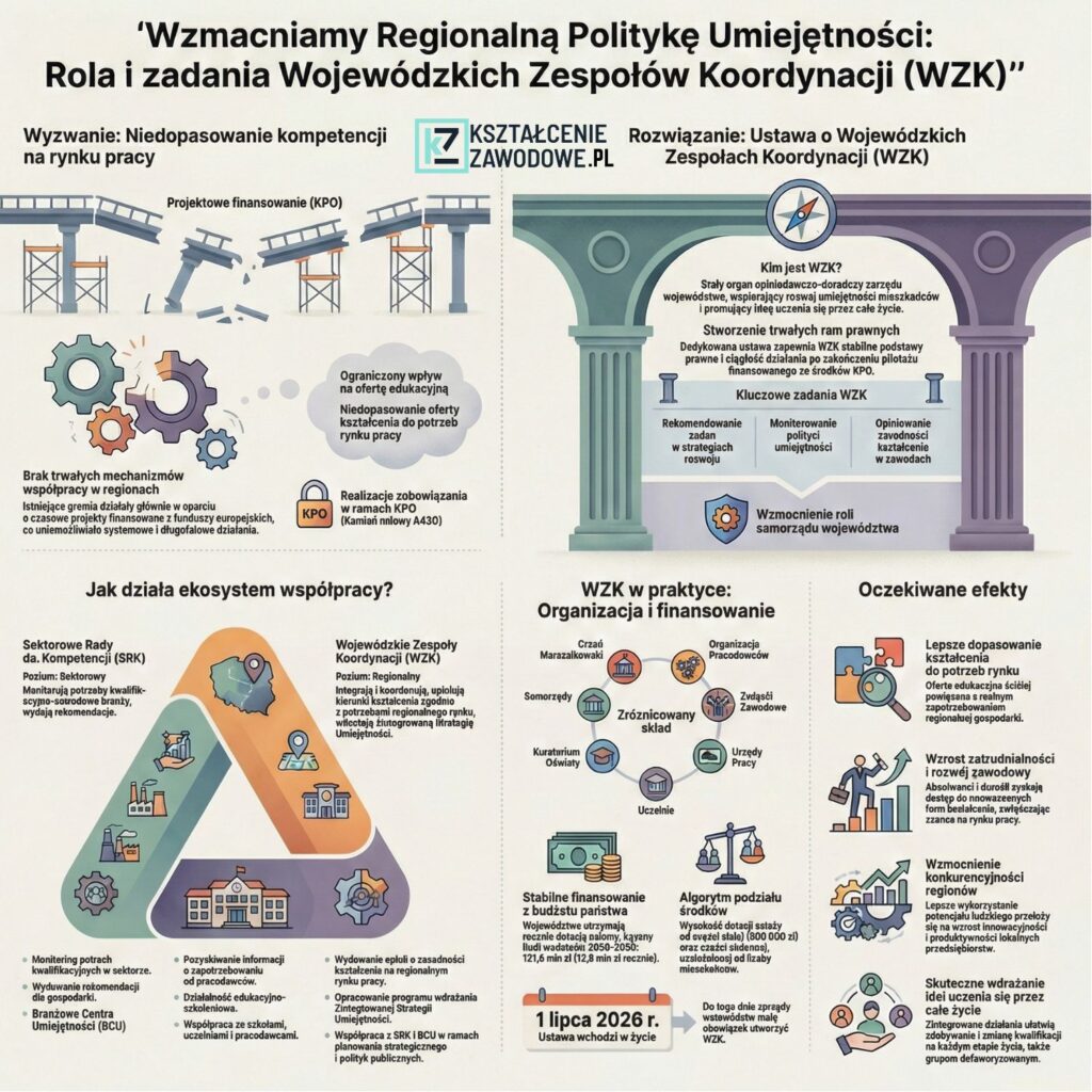 Polska stoi przed wyzwaniem systemowego dopasowania edukacji zawodowej do dynamicznie zmieniającego się rynku pracy. Odpowiedzią na te potrzeby ma być projekt ustawy o Wojewódzkich Zespołach Koordynacji (WZK) do spraw polityki umiejętności. Do tej pory WZK funkcjonowały w formie pilotażu, a ich dalsze istnienie wymagało umocowania ustawowego, by uniknąć zakończenia działalności wraz z wygaśnięciem finansowania projektowego. Wsparcie rozwoju nowoczesnego kształcenia zawodowego, szkolnictwa wyższego oraz uczenia się przez całe życie.Potrzeba powołania WZK wynika bezpośrednio z braku trwałych mechanizmów współpracy w obszarze uczenia się przez całe życie, kształcenia zawodowego oraz edukacji dorosłych na poziomie regionalnym. Nowe przepisy mają na celu przekształcenie dotychczasowych działań pilotażowych (projektowych) w trwały mechanizm zarządzania kapitałem ludzkim w regionach.